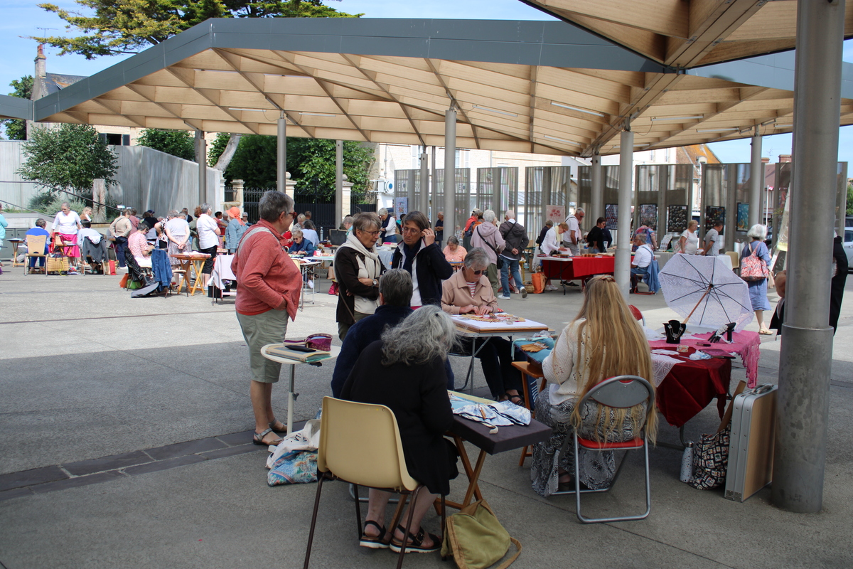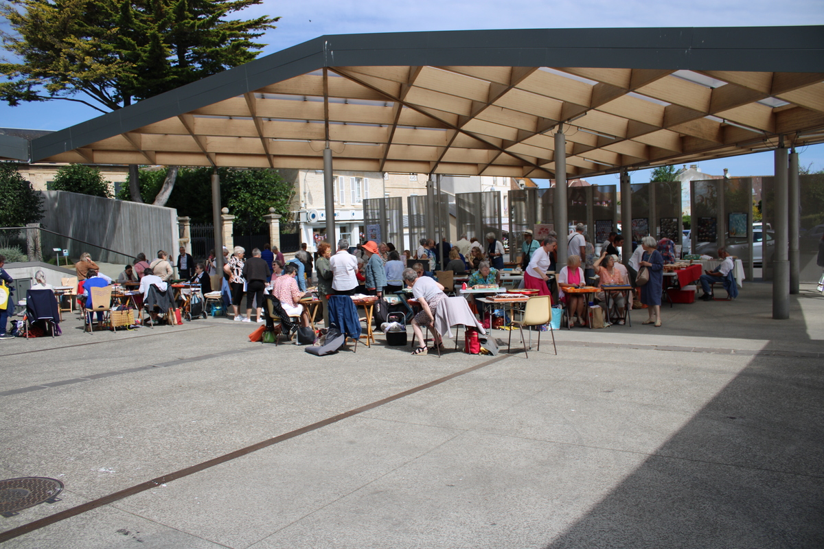 Un lieu sous la halle à Courseulles en extérieur, nous avons eu la chance d'avoir le soleil le matin et 1h de pluie en début d’après-midi, tout le monde s'est regroupé pour de la rigolade.