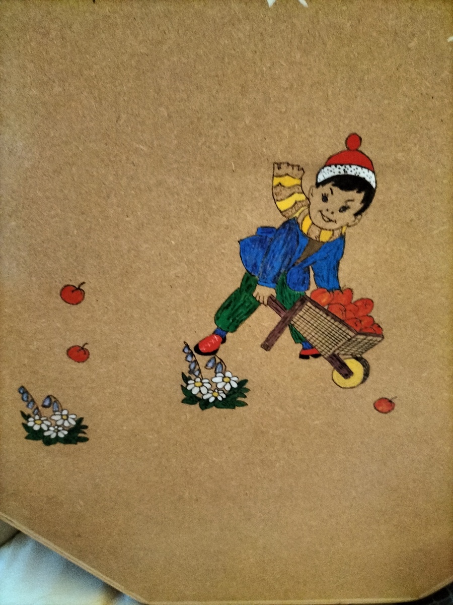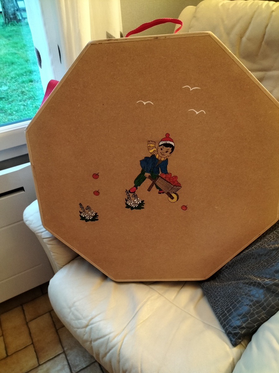 Merci à la dentellière Geneviève, qui nous fait parvenir une photo du couvercle de son carreau qui a une dixième années. Elle l’a agrémenté en mettant de la couleur sur la pyrogravure. Il est personnalisé bravo